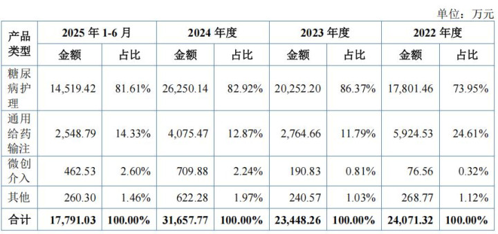 报告期内,公司主营业务收入占比最高的产品大类是糖尿病护理类,其次是通用给药输注类,近年来公司重点投入研发了微创介入系列新产品,公司微创介入产品线由于推向市场的时间不长,且还有较多管线处于研发过程中,因而报告期内销售额整体不高,报告期三年一期公司微创介入类产品销售额分别为76.56万元、190.83万元、709.88万元、462.53万元,占主营业务收入的比例分别为0.32%、0.81%、2.24%、2.60%。