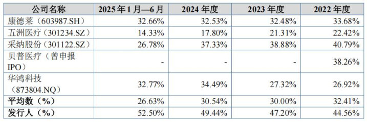报告期内胰岛素笔针产品是公司销售占比最高的产品类别,导致公司综合毛利率分别为44.56%、47.20%、49.44%、52.50%,高于主营业务更侧重通用给药输注产品或其他糖尿病护理产品的同行业可比公司。